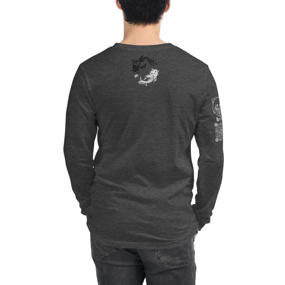 Featuring two koi friends from my digital painting 'In Circles," with a smaller version on the back. On the right sleeve you'll be representing with my logo and instagram QR code to show off the steeze.