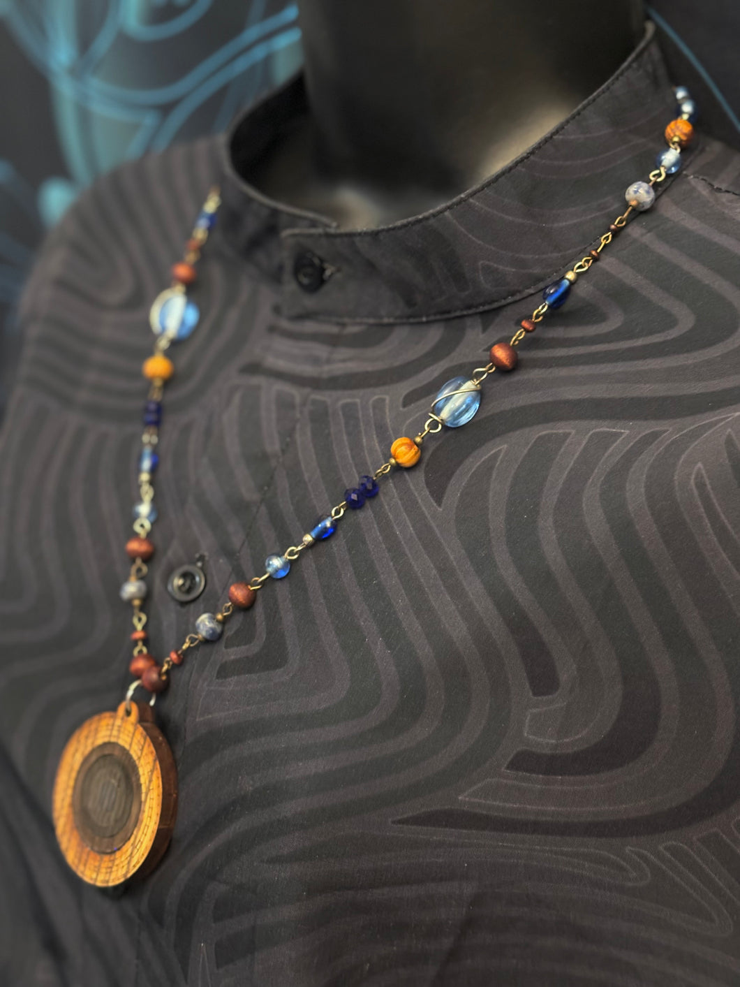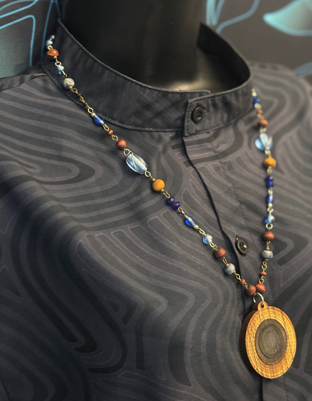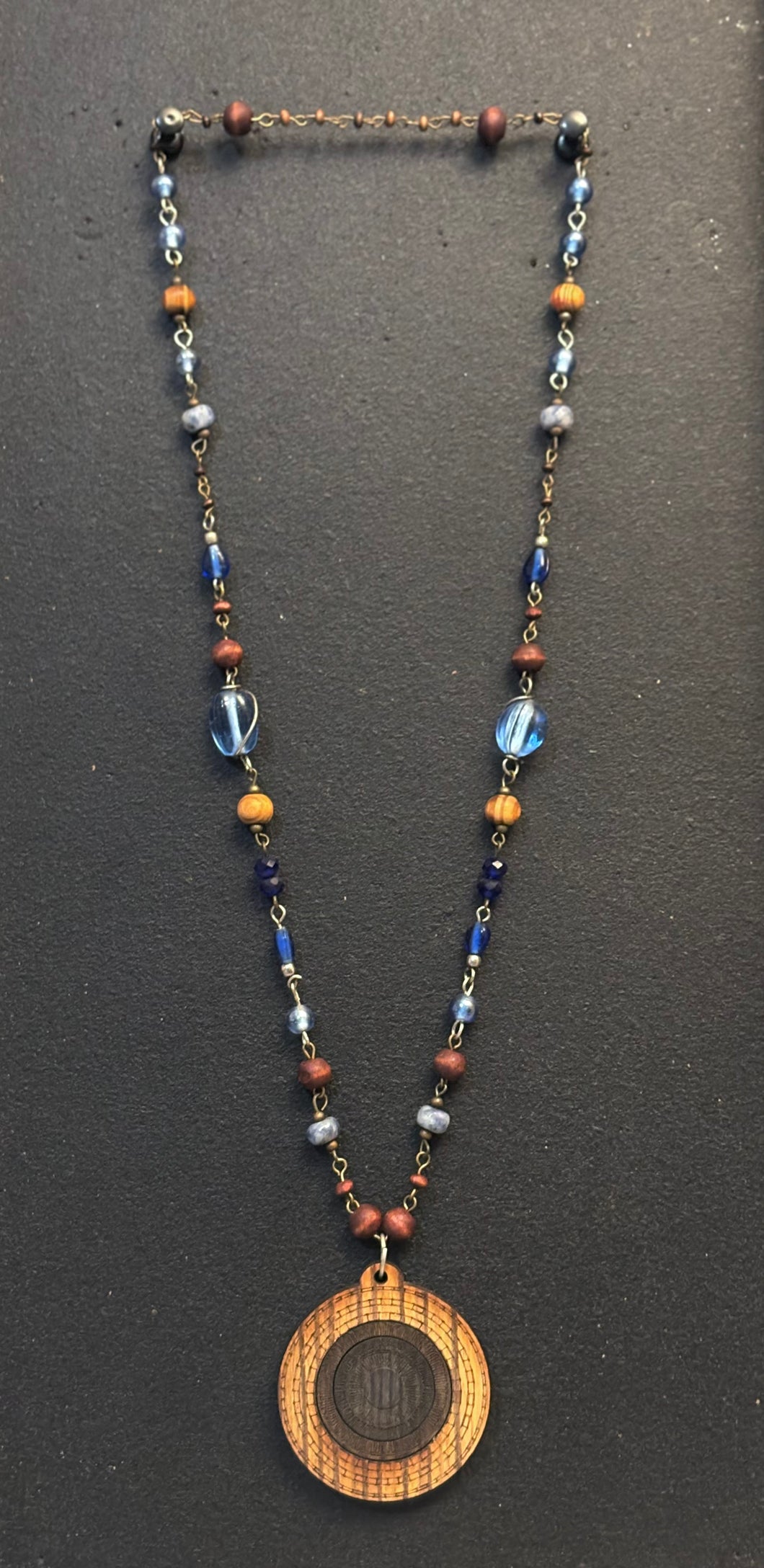 4-Wood Circle Pendant with Sodalite, Vintage, and Wood Beads