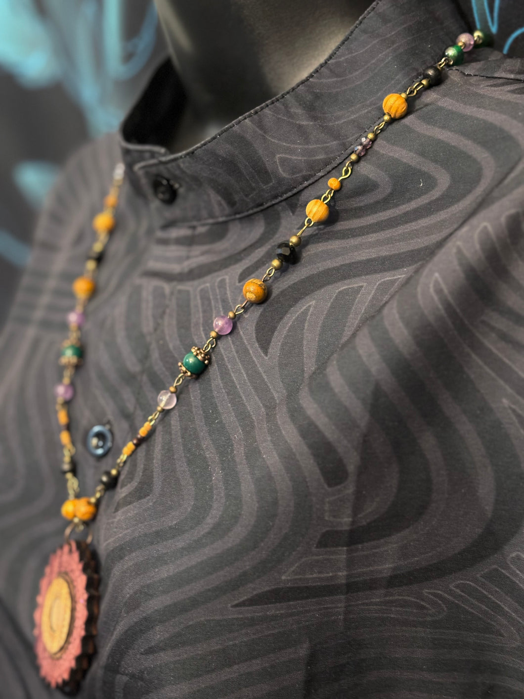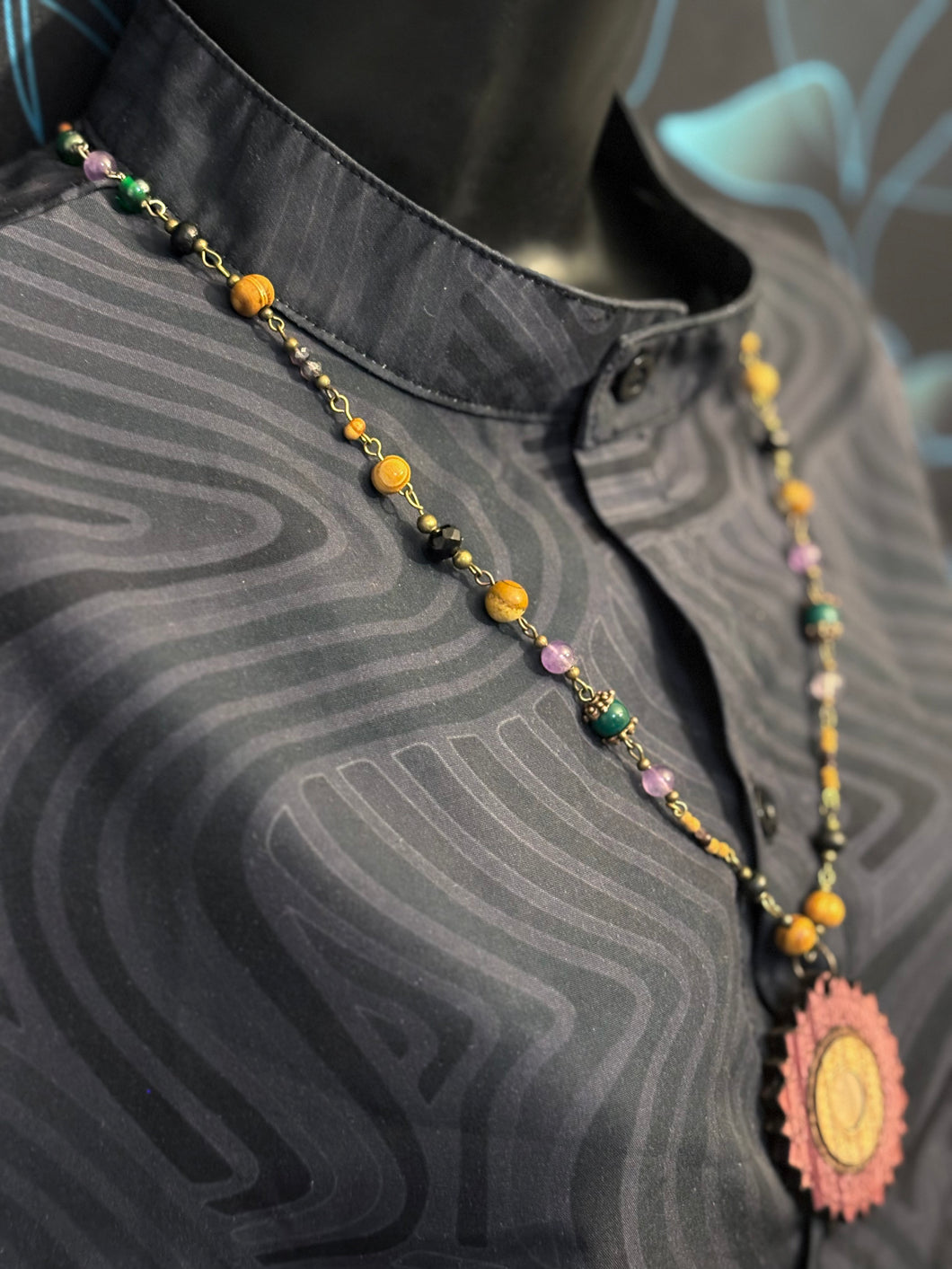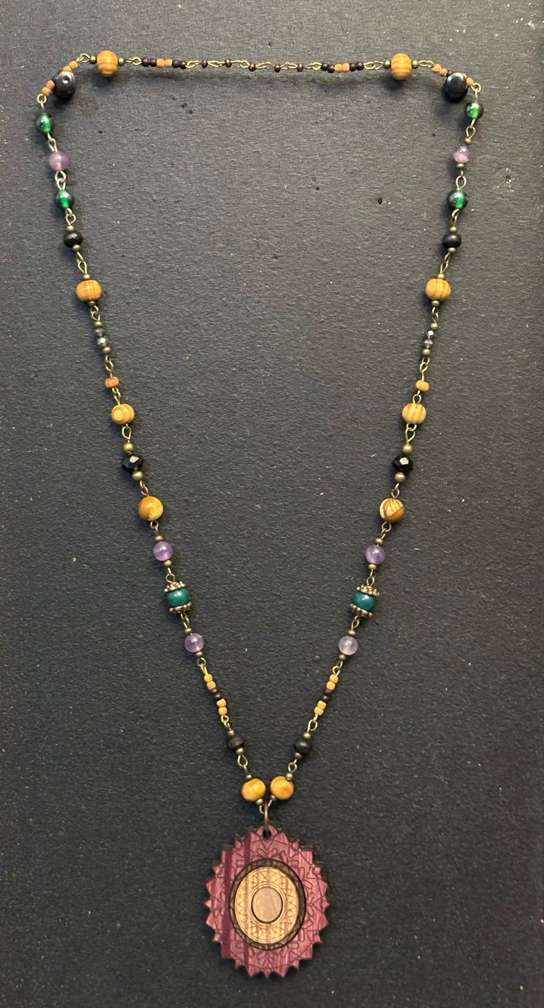 5-Wood Oval Pendant w/ Amethyst, Vintage Glass, Wood Beads