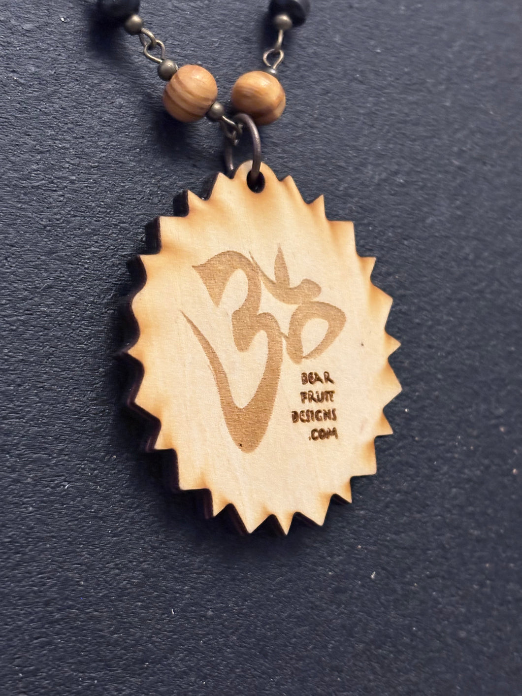 Pendant made with Purpleheart, Wenge, Zebrawood, White Oak, with a Basswood back. Engraved and cut with my Glowforge laser engraver, assembled by me. Seriously one of a kind.