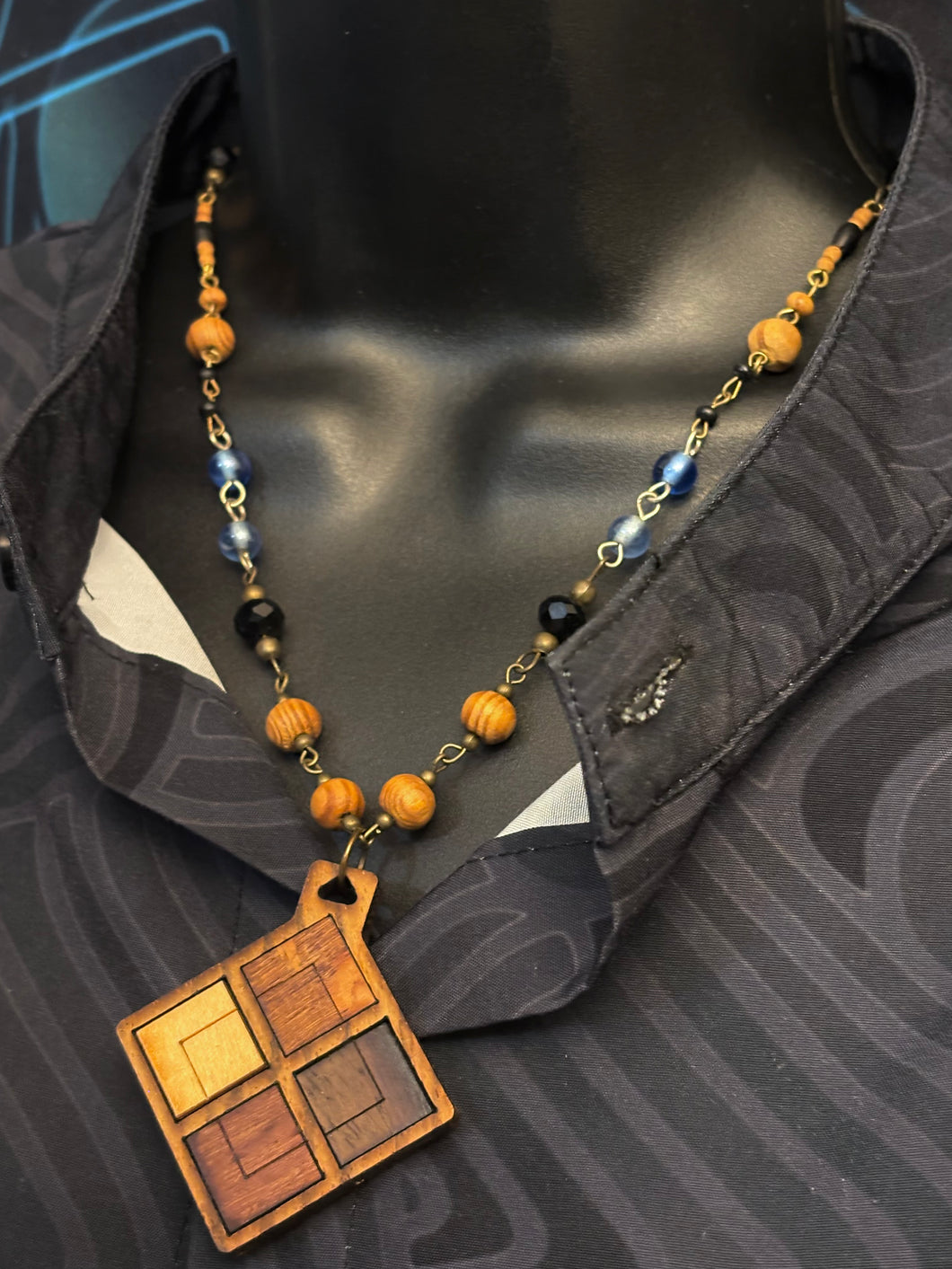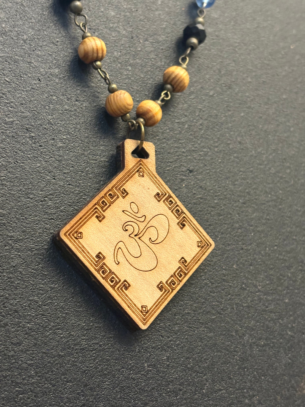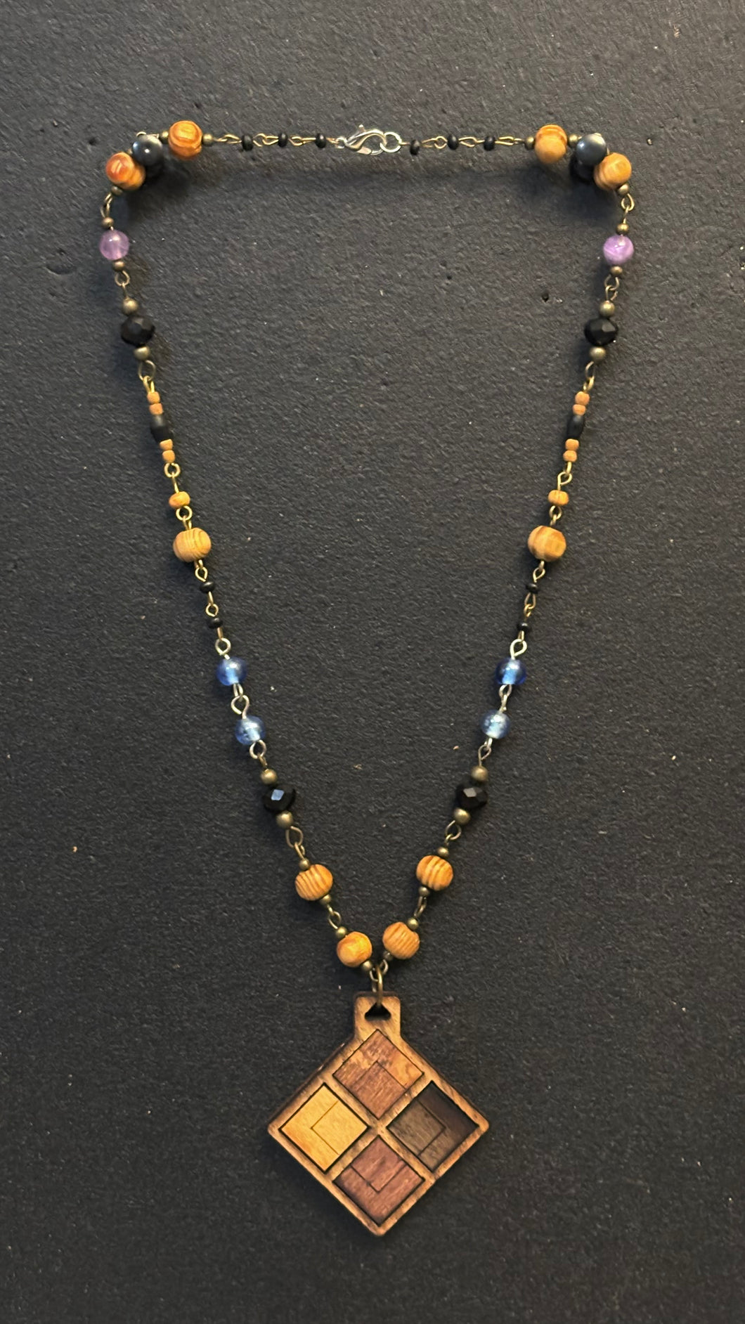 6-Wood Diamond Pendant with Vintage, Amethyst, Wood Beads
