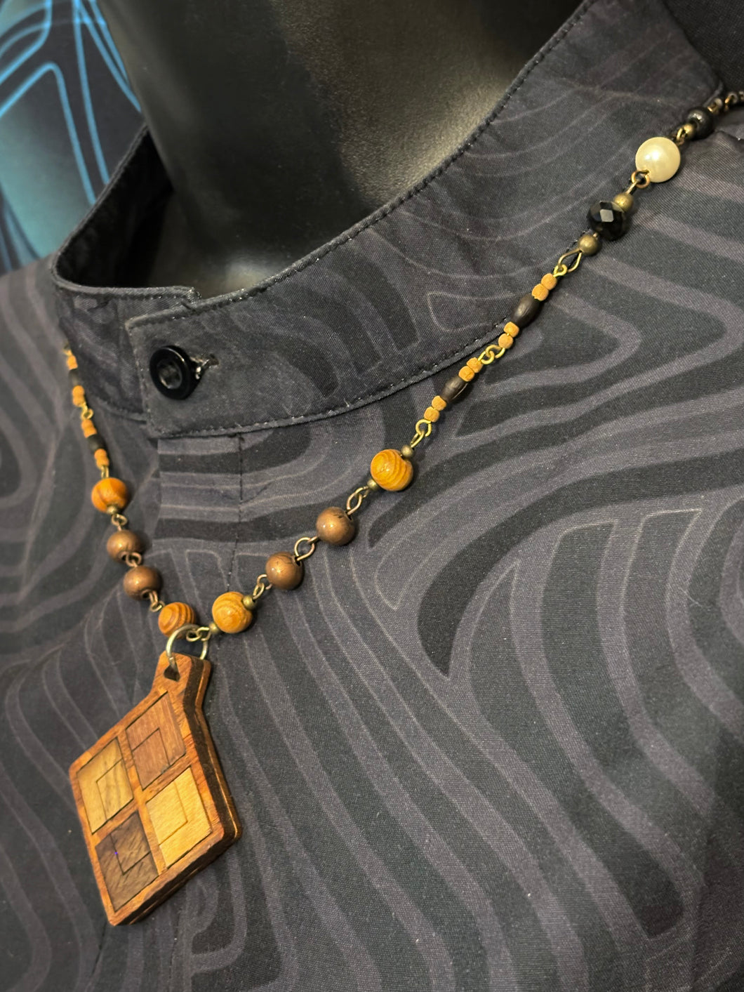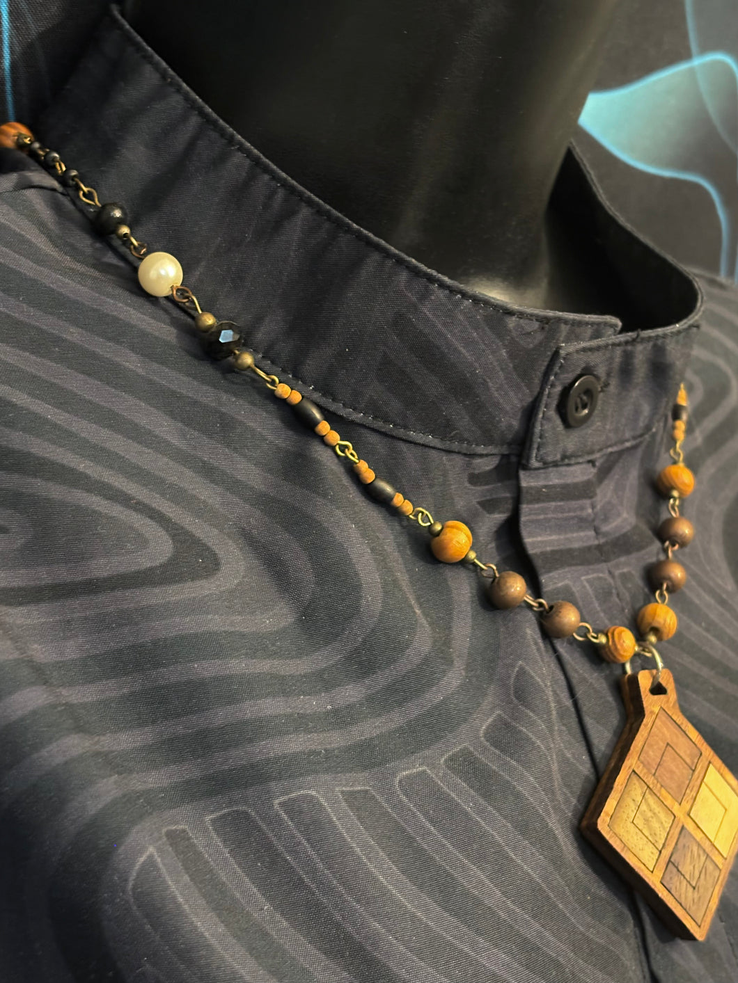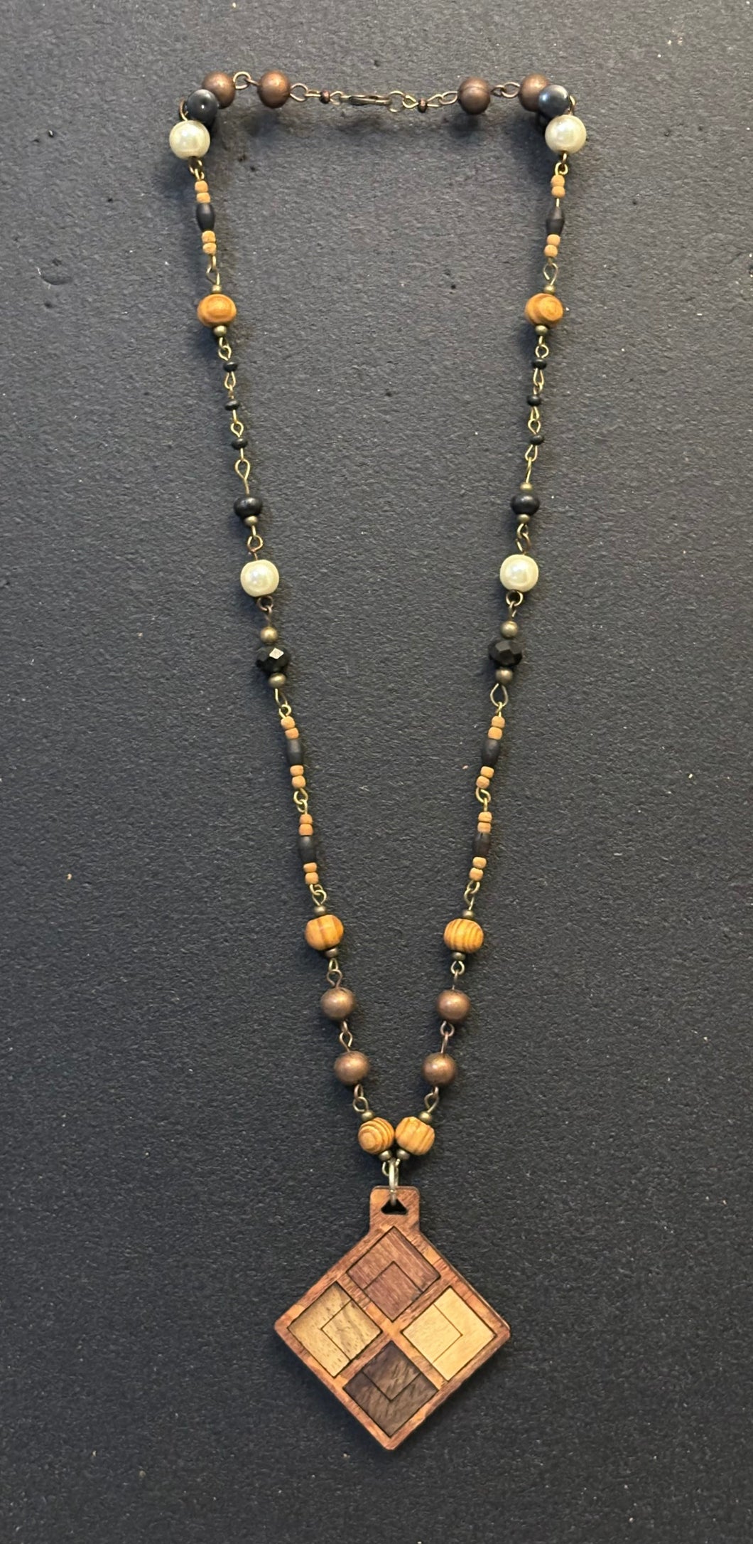 6-Wood Diamond Pendant w/ Brass, Glass, Wood Beads