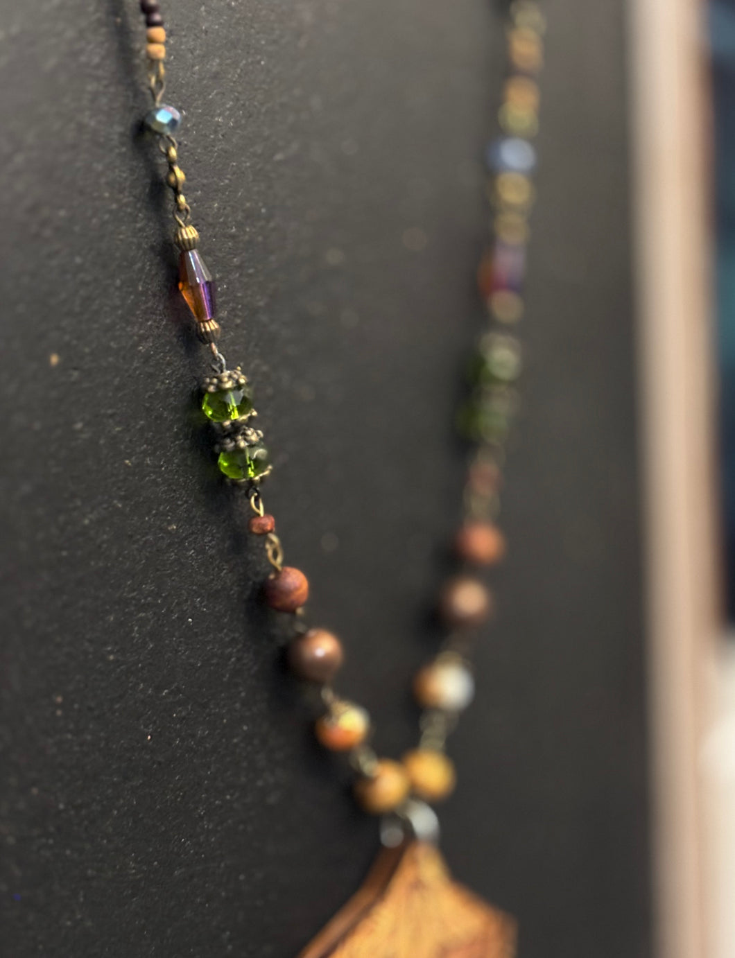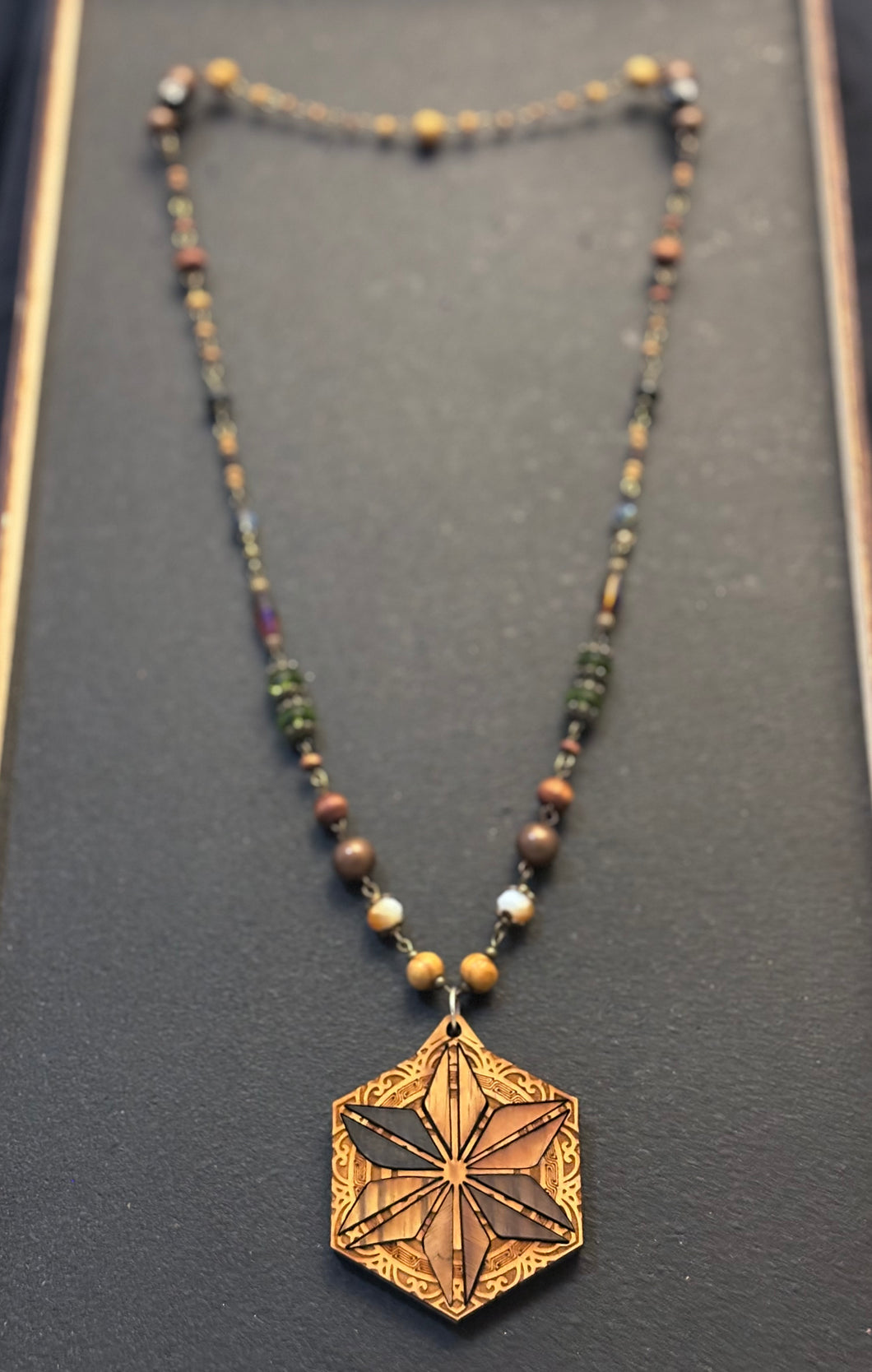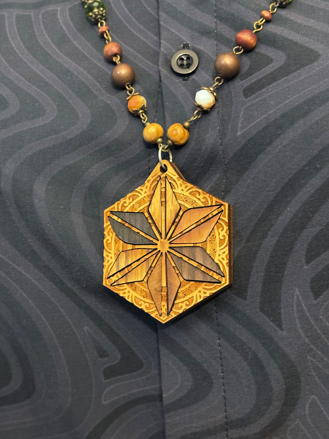 8-Wood Asanoha Pendant w/ Brass, Vintage Glass, Wood Beads